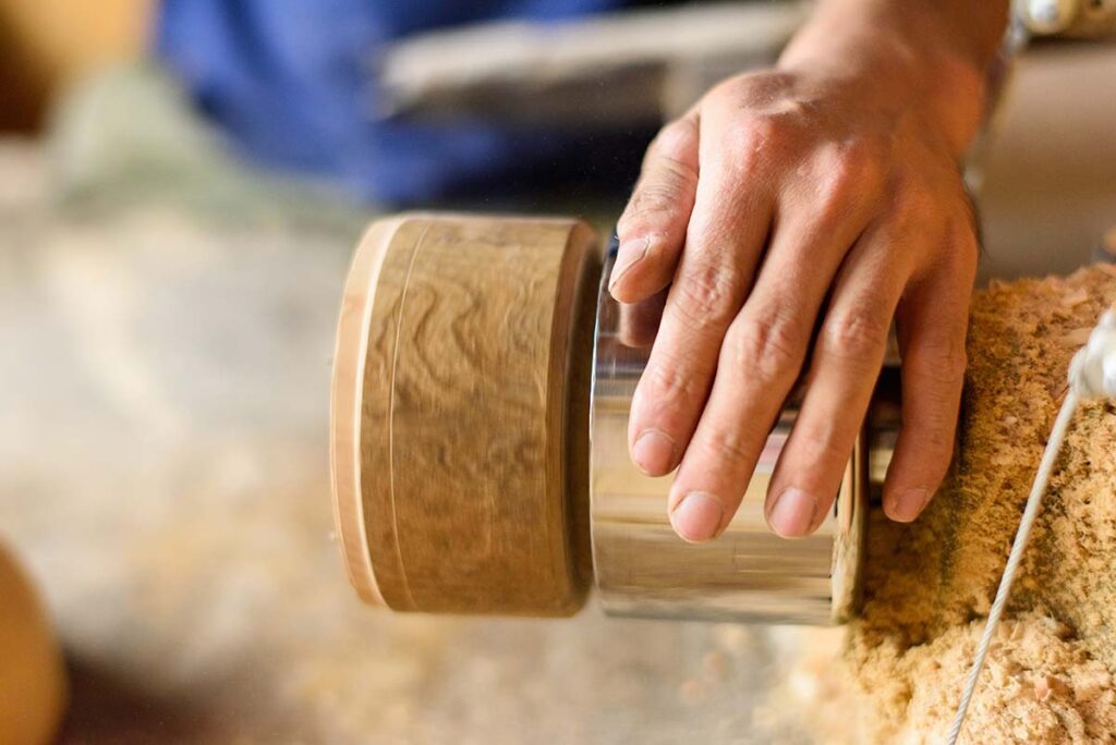 山中漆器の発祥は木地挽きが始まるところから発展してきました。そのため山中の木地は、他の産地とは異なった高度な技術で、薄挽きや筋挽きを生かした優れた木地が特徴です。